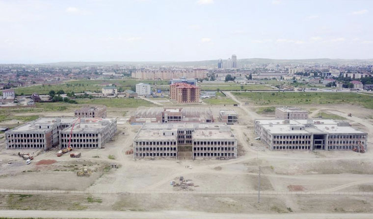 На возводящемся в столице Чеченской Республики Международном грозненском университете строителями проводится монтаж несущих конструкций всех зданий и сооружений объекта (фундаменты, монолитные каркасы, кирпичная кладка стен, парапеты). При этом практически завершены устройство и монтаж конструкций кровли.