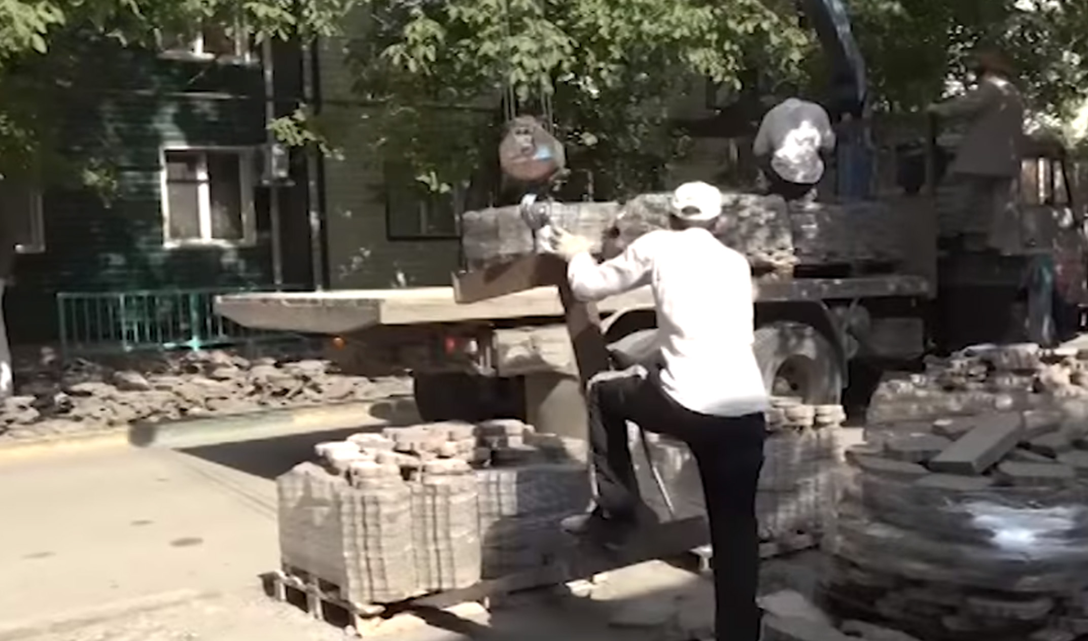 Рабочие трудятся, несмотря на 40-градусную жару. Масштабный ремонт начали с демонтажа старого покрытия. В скором времени дворы будет не узнать.