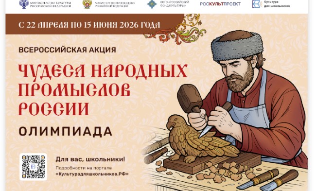 С 22 апреля по 15 июня 2026 года в рамках межведомственного культурно-образовательного проекта «Культура для школьников» пройдет всероссийская акция «Чудеса народных промыслов России. Олимпиада».