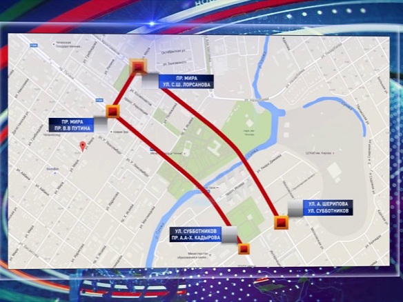 С 20.00 сегодняшнего дня и до полуночи завтрашнего дня будет перекрыто движение на следующим улицах: от перекрестка с улицы Субботникова по проспектам Кадырова и Путина до проспекта Мира, далее по проспекту Мира до перекрестка с улицей Лорсанова, с выходом на Шерипова до перекрестка с улицей Субботникова.